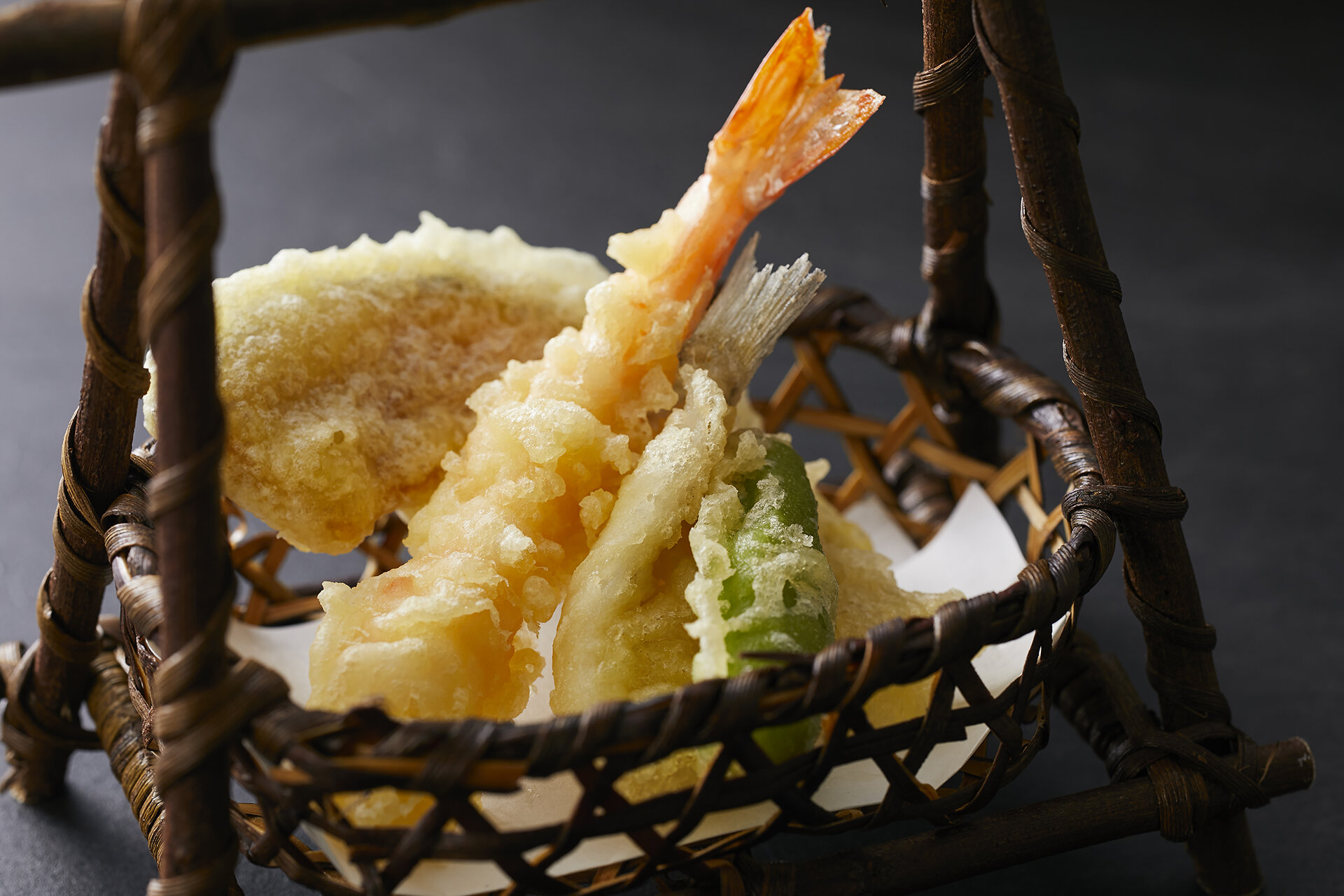 | 揚物 | 海老と鱚の天麩羅 / 南京 青唐 抹茶塩 |