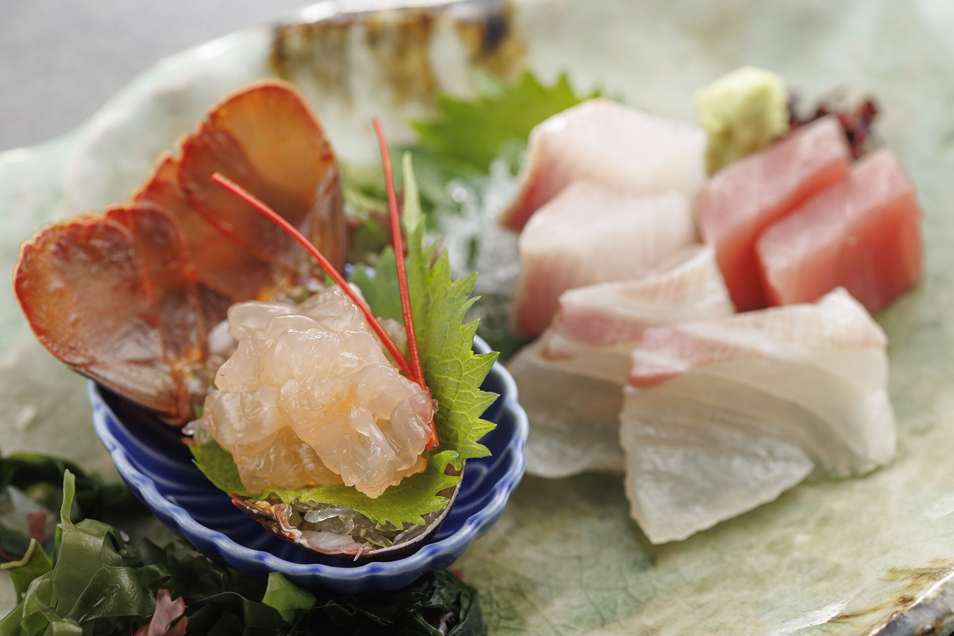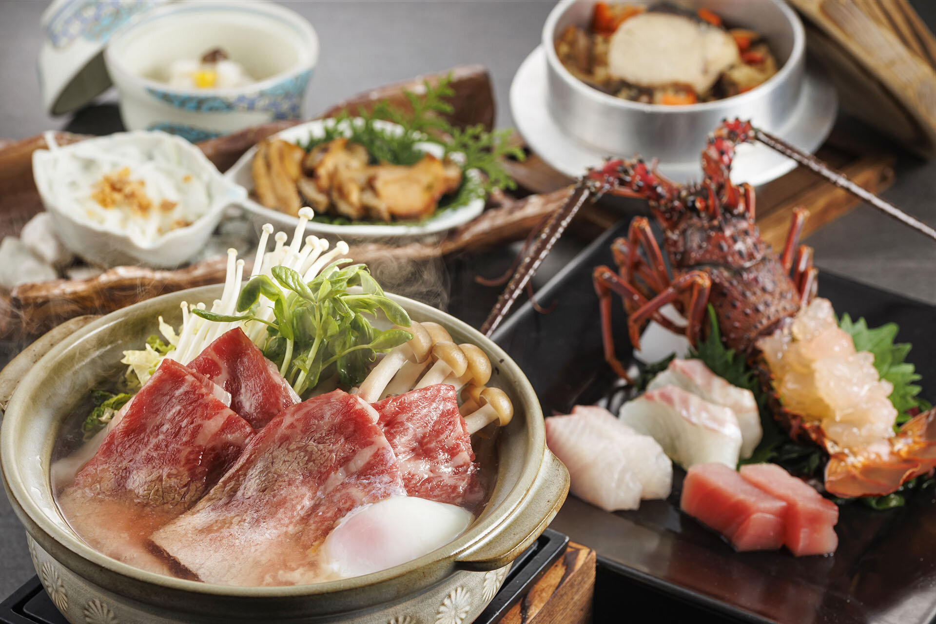 「伊勢海老」「松阪牛」「鮑」の三大味覚をメインにした贅沢な会席料理。伊勢志摩の恵みを存分に味わいください。