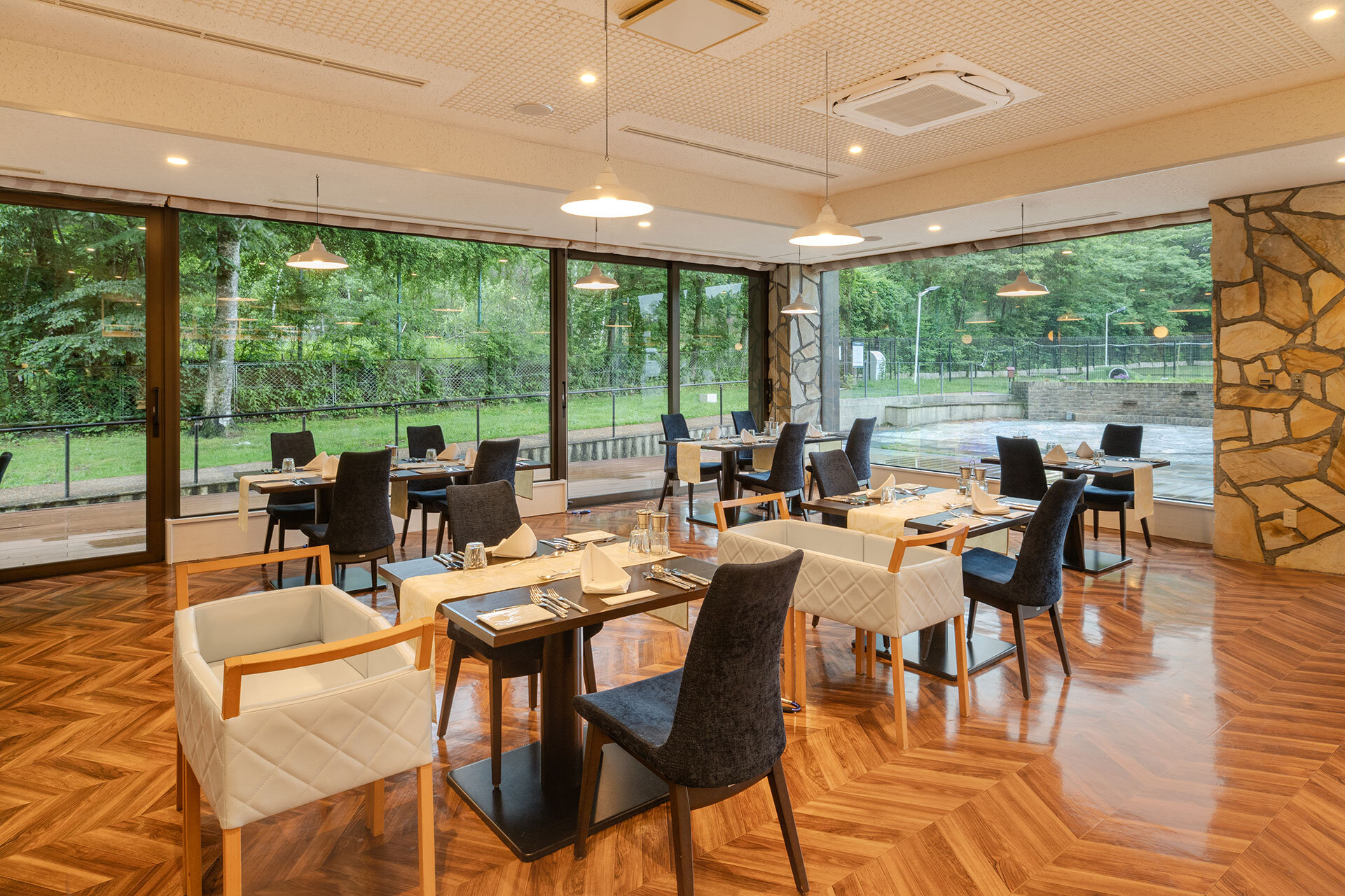 白と木目調を基調とした上質なレストランでは、山梨県の特産であるワインを豊富に取り揃えております。雄大な富士山を眺めながらお食事をお愉しみください。