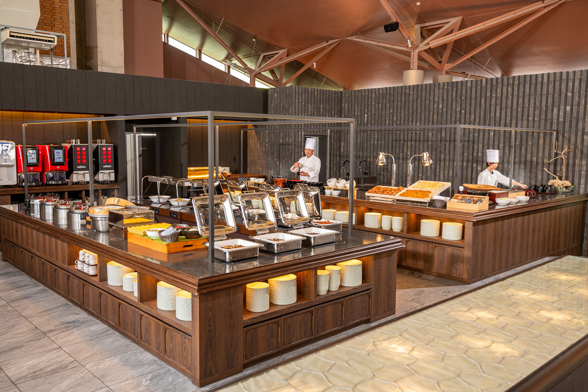 シェフが目の前で調理するライブキッチンでは朝食に人気の「パンケーキ」「ワッフル」、和食派の方には「焼きおにぎり」や「焼きおにぎり茶漬け」を提供します。