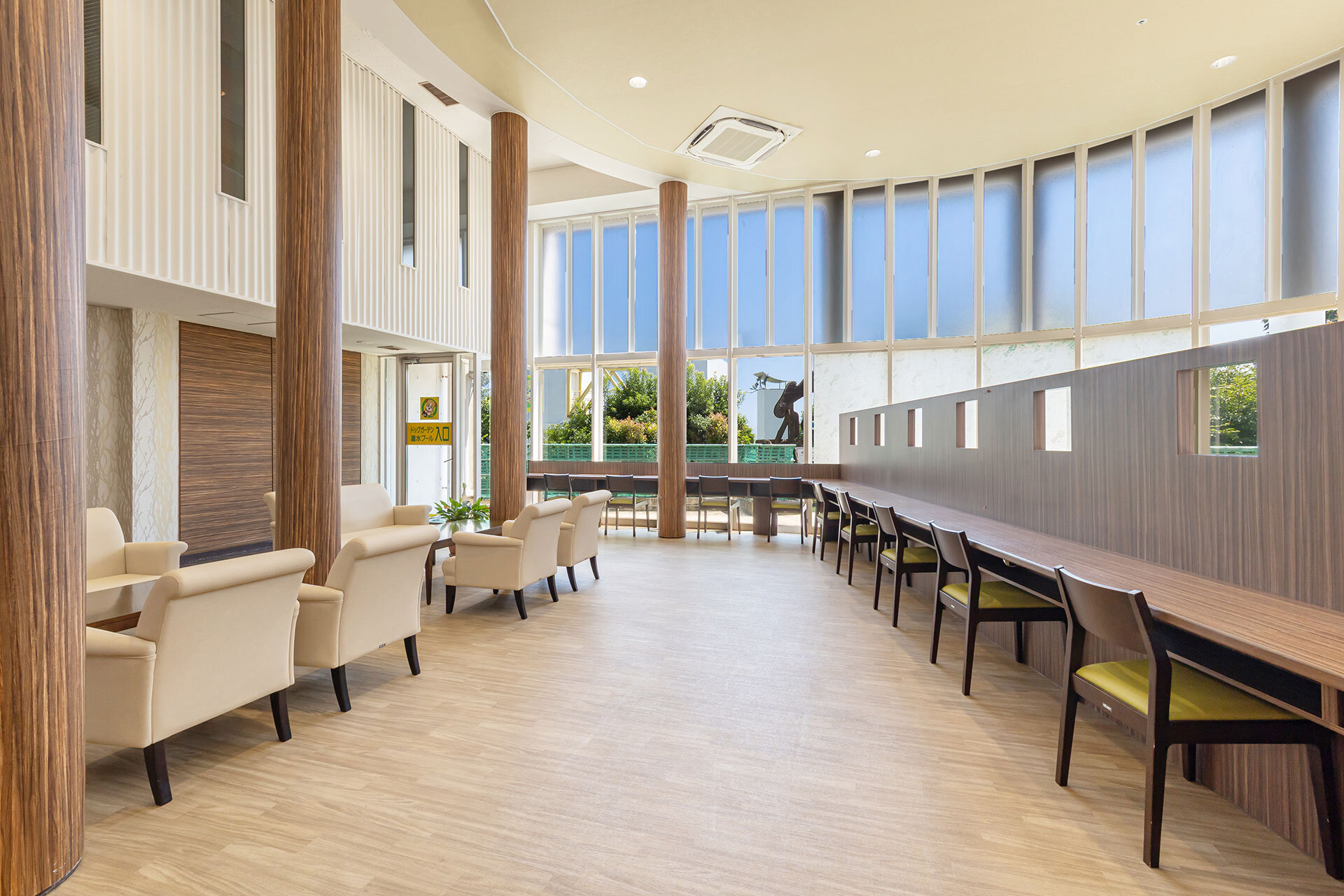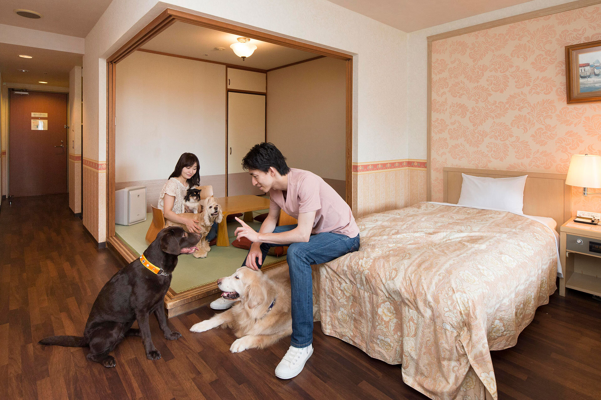 木目調の落ち着いた雰囲気のロビーや、お土産や愛犬グッズなど充実した売店、愛犬と一緒に入れるカラオケルームをご利用いただけます。