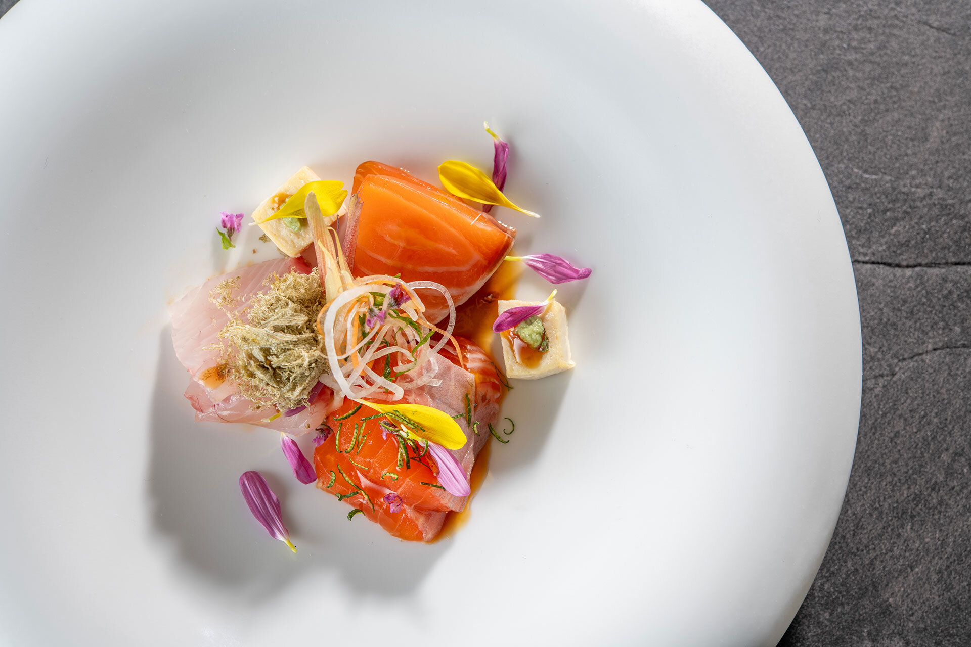 ノルウェーと信州の二種のサーモンを食べ比べる趣向を凝らしたお造りが好奇心を刺激します。
