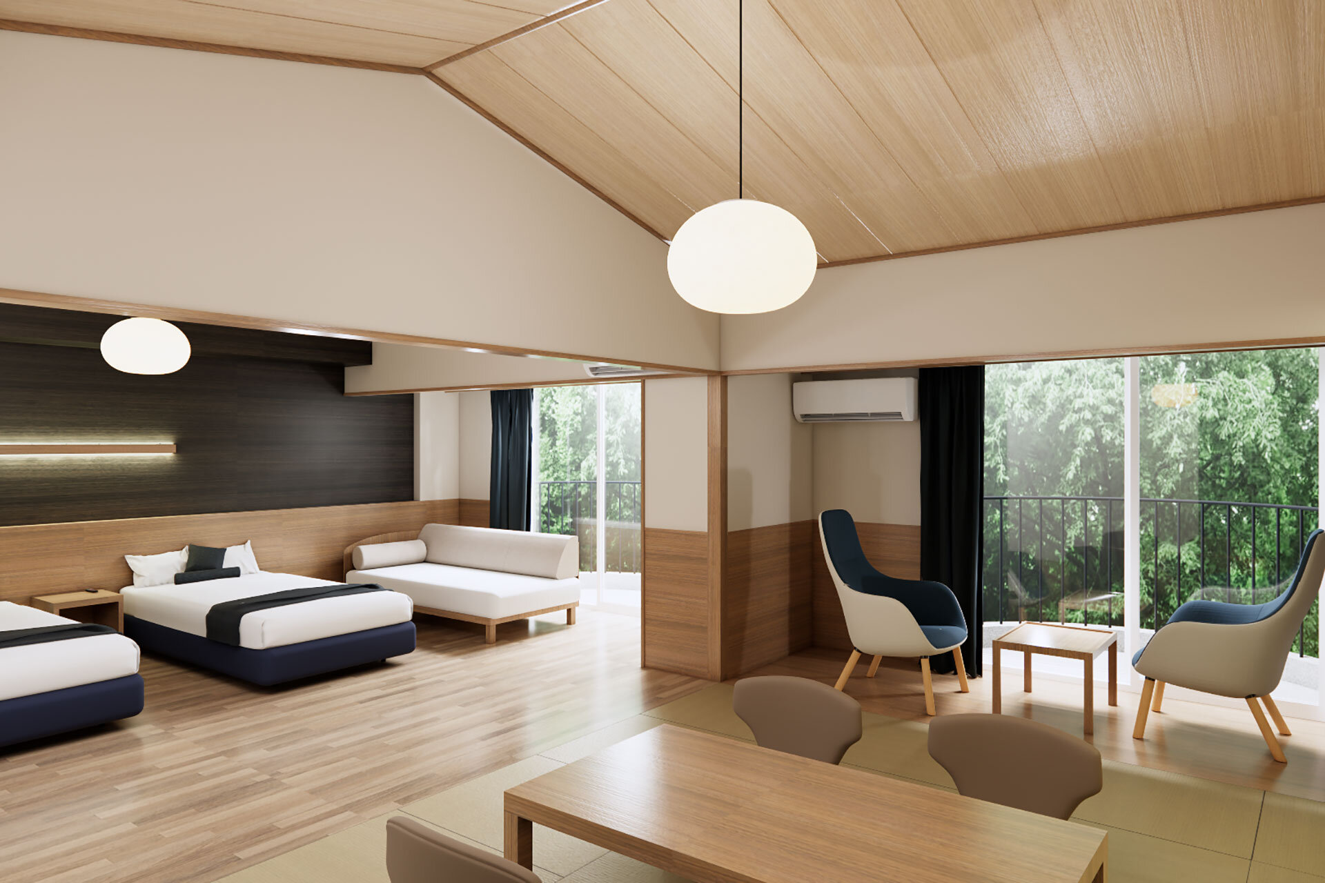 바다를 바라보는 잔디의 도그랑에 직결해, 고리를 기조로 한 넓은 객실입니다.
