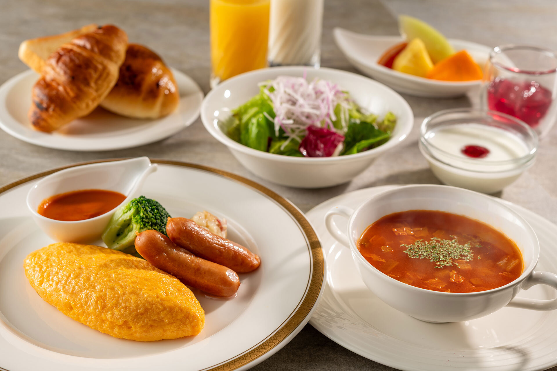 焼き立てクロワッサン付きのご朝食は、メインの卵料理を2種類からお選びいただけます。