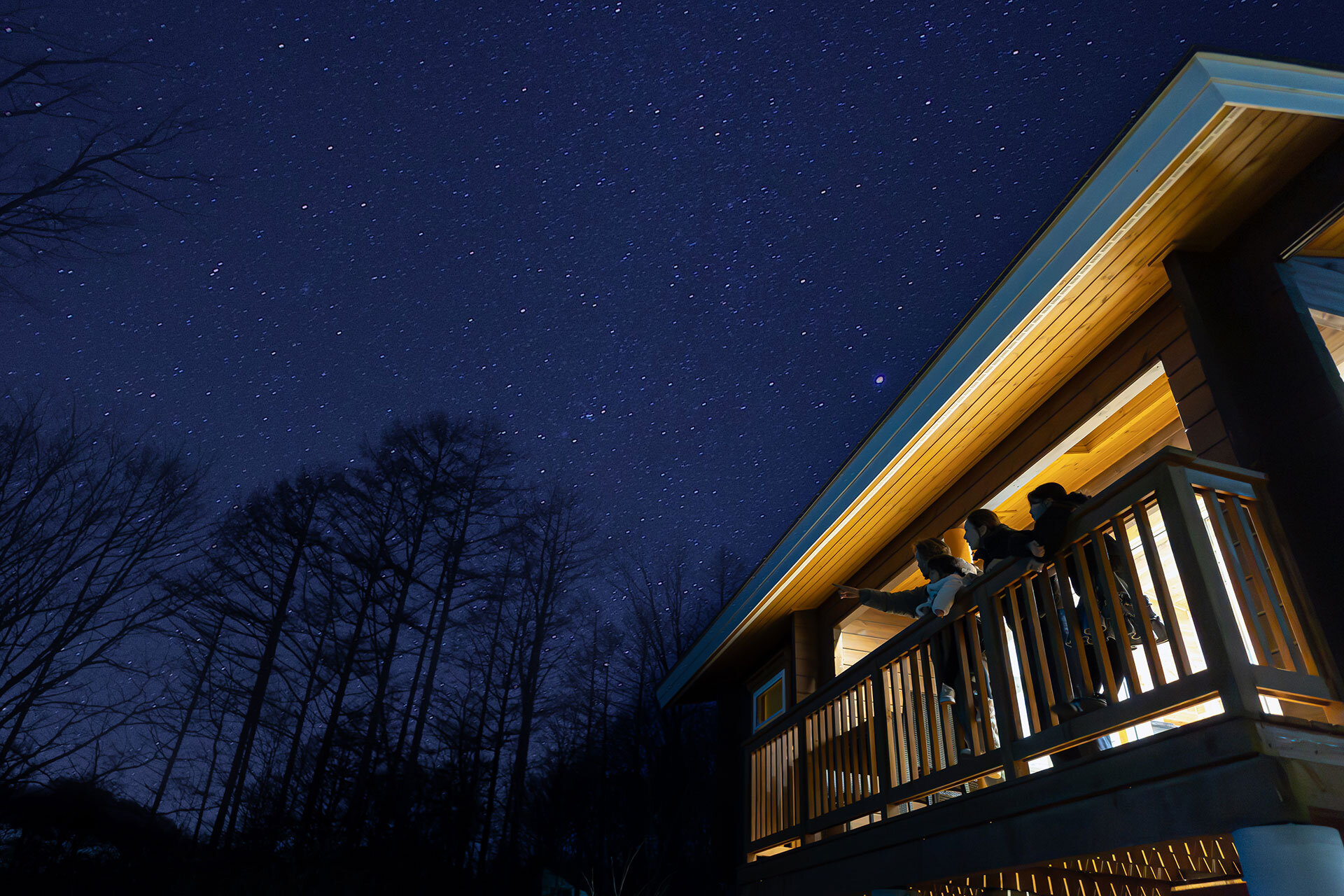 コテージの室内灯を消してテラスに出ると、数分で目が慣れ、驚くほど多くの星が見えてきます。普段では見ることのできない満点の星空を楽しむことができます。